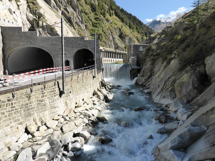 UK and Europe Roadtrip - Over Alp/Oberalp PassThe tunnel for the Glacier Express is on the right and the car tunnel is on the left. The Rhine River charges under and around them. What an amazing piece of engineering for this to survive each winter. Previous | Album | Next |