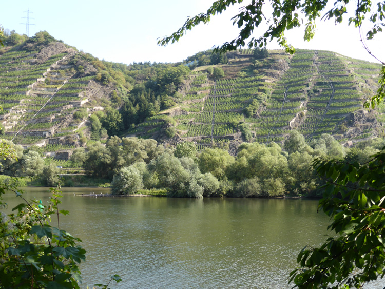 UK and Europe Roadtrip - Mosel Tourist RouteThe Mosel Wine Route is a popular tourist drive that takes you through over 200km of beautiful scenery. Many of the vineyards, mostly growing the riesling grapes, are set up on quite steep slopes like this. Select the photo below to see the viaduct we are about to cross over the Mosel River. Previous | Album | Next |