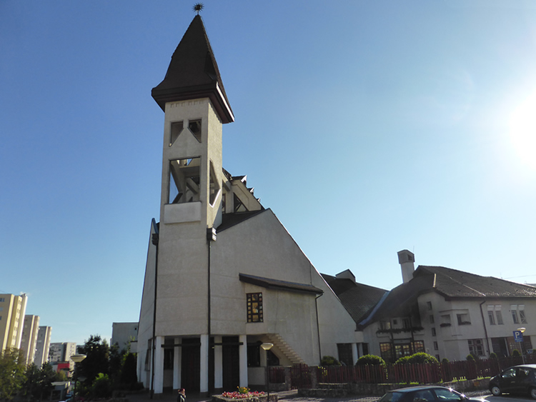 UK and Europe Roadtrip - Cluj NapocaThe Reformed Church of Koloz Monastery is very unusual in its design and also one of the newer churches in Cluj Napoca. . Its name refers to the ancient Kolozsvár Abbey which was the first Benedictine monastery in Transylvania. Select the photo below to see the more impressive Romanian Orthodox Cathedral. Previous | Album | Next |