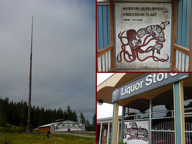 Port McNeill to Campbell River - Vancouver IslandThe native artwork adorns many buildings including the local liquor store and seafood processing plant as well as the Big House where you will find the tallest totem pole on the island. Jaimie is standing near it to give you an idea of the height. Previous | Album | Next |