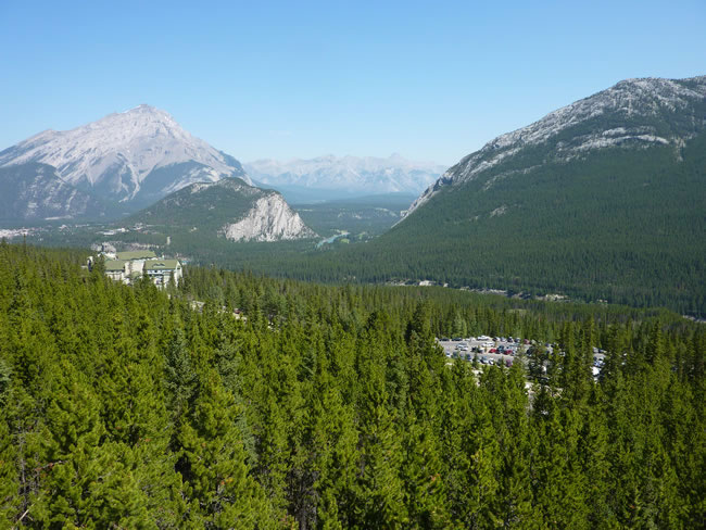 Calgary to Banff - Alberta CanadaAfter a catch-up day, washing, visiting with friends, shopping, we did a day trip to Banff. We took the gondola (chairlift) up Sulphur Mountain and enjoyed the views as it took you up 700m. The Summit Upper Terminal is almost 2300m above sea level and you have a 360 view of various Rocky Mountain ranges. You can see the Bow River in the centre of the photo and Banff in the distance over to the left. Previous | Album | Next |