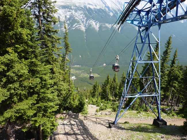 Calgary to Banff - Alberta CanadaIt is an eight minute journey to the summit of Sulphur Mountain in the fully-enclosed four passenger gondola cabin. There are walking tracks all teh way up for those with more time and more energy but you can see it is pretty steep. Previous | Album | Next |