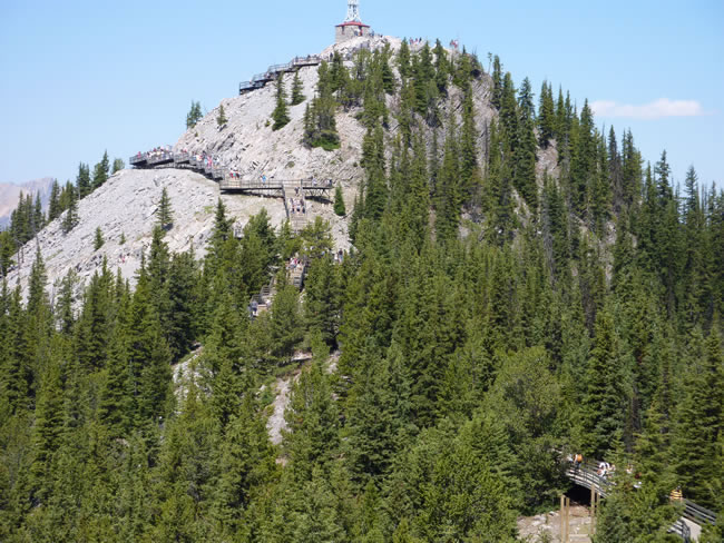 Calgary to Banff - Alberta CanadaWe saw mountain goats and squirrels along the walk. Well, we thought they were goats but maybe they were sheep. They tell us the local wildlife we will see are mostly Rocky Mountain bighorn sheep, Golden mantled ground squirrels and Hoary marmots. Select the photo below and see what you think. This photo shows the 1km track they call the Banff Skywalk. It skirts along the summit ridge and leads to the Cosmic Ray Station which is a National Historic Site of Canada. This is also the historic Sanson’s Peak Meteorological Station. Due to its high elevation Sulphur Mountain was one of the most important cosmic ray stations that took part in the International Geophysical Year (1957-1958) study, involving 66 countries, to study the sun’s affect on the earth's atmosphere and environment. Previous | Album | Next |