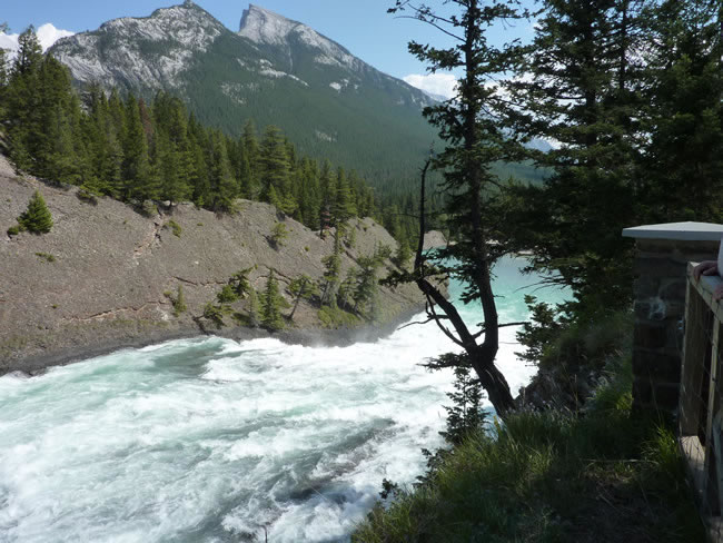 Calgary to Banff - Alberta CanadaThe turquoise water thunders down over the Bow falls as it flows towards where it meets the Spray River. The jagged peaks of Mt Rundell tower above it all and look like they still have a sprinkling of snow even though it is mid summer. It is however, just bare rocks where the trees coverage is slight. Previous | Album | Next |
