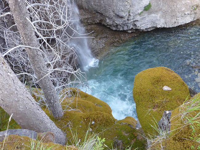 Calgary to Banff - Alberta CanadaWe were entranced by the view looking down into Johnston Canyon. The rocks are carpeted in green moss which is kept moist from the fine mist spray coming from the Upper Falls as it plunges into the pool below. Previous | Album | Next |