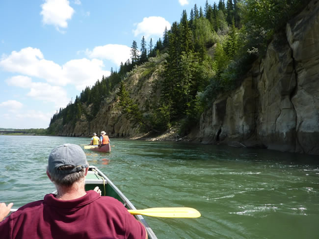 North Saskatchewan River near EdmontonWe spotted a number of eagles with nests in the tallest trees or along the cliffs. Select the photo below to see! At a couple of spots we ALMOST had rapids as the water swirled around bends or islands in the river. The funniest thing was Bev & Phil trying to land the canoe on one of the islands but getting caught up in the fast flowing water and almost going airborne in their canoe as they hit the point of the island. Lunch got wet but the camera and oars were saved and no major injury! Previous | Album | Next |