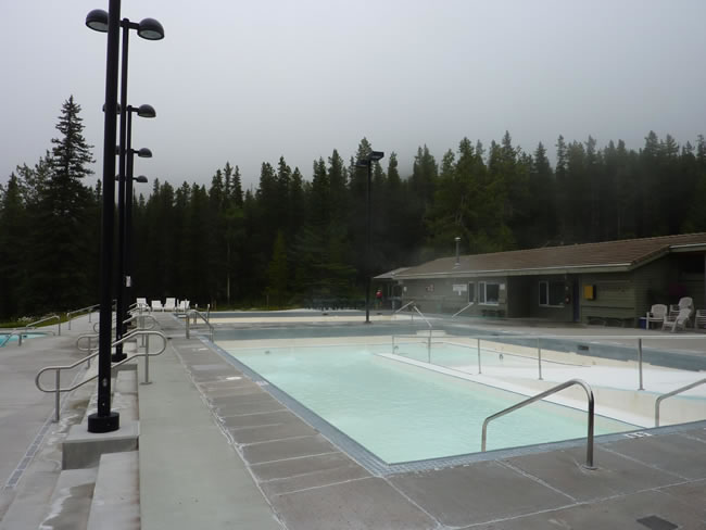 Edmonton to Jasper, AlbertaThe mineral rich hot water is piped back to this pool. Bathers have been coming to the beautiful Fiddle Valley since the turn of the century to swim in these soothing warm mineral-rich waters. The ruins of the old spring baths are still there by the creek. Select the photo to see the old ruins. We hiked back 2.5km to the Empress and tried again with still no luck. All the tricks that had worked before didn't seem to tempt her to start. We flagged down a passing motorist, Sion from Ghana, who was happy to help. Petrol (gas) in the 'carby' finally did the trick and we continued on our trip to Jasper. Thanks Sion and the maintenance man at the Springs who gave us the orange juice bottle filled with petrol (gas) to help us on our way! Previous | Album | Next |