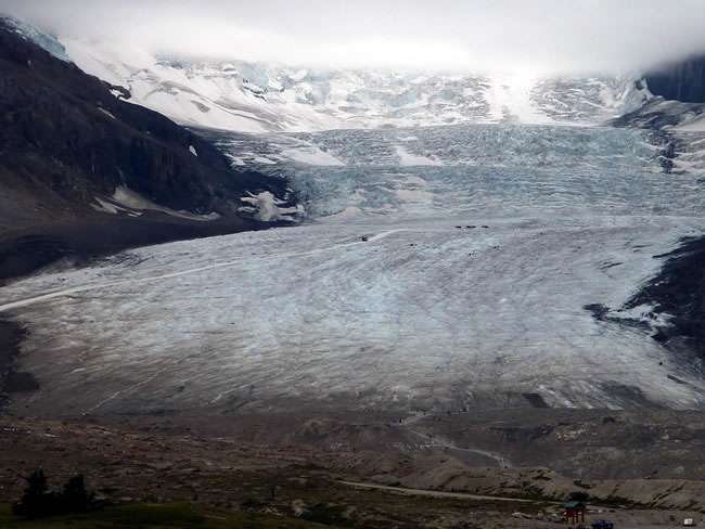 Icefields Parkway from JasperFrom back up on the road again you get a better idea of the enormous size of the Athabasca Glacier. That is a bus you can see in the middle of the photo, driving over the glacier taking hikers further out onto the glacier to begin a trek. We can't see a lot of the glacier as it is quite an overcast day and the clouds are sitting low on the mountains. Previous | Album | Next |