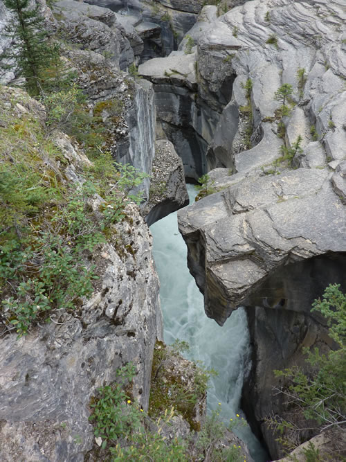 Icefields Parkway from JasperLooking down into the canyon you hear and feel the water rushing through the VERY narrow winding curves of the Mistaya canyon. Potholes in the rocks are formed by the swirling water and rock debris. In winter you would see frozen ice sculptures hanging from the canyon walls. About 4km downstream from here the Mistaya River joins the North Saskatchewan River. Previous | Album | Next |