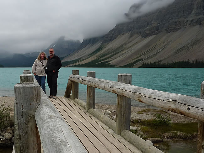 Banff National Park, AlbertaThe Icefields Parkway continues in the same direction as the Bow River through the Canadian Rockies. We stopped to walk around Bow Lake which is a beautiful blue colour as are most of the lakes we have visited. The clouds are hanging quite low on the mountain ranges but the scenery is still wonderful. Previous | Album | Next |