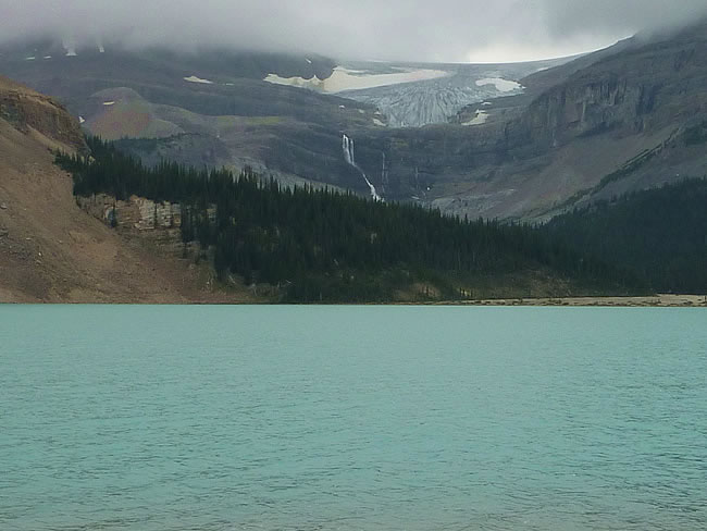 Banff Nation Park, AlbertaBow Lake is a glacial lake with the Bow River feeding into and out of it. From here (on a fine day!) you can see the Wapta Icefield, Bow Glacier, Bow Peak, Mount Thompson, Crowfoot Glacier and Crowfoot Mountain. This is a view of the Crowfoot Glacier and as it melts the run off supplies the falls which make their way into this lake. Previous | Album | Next |