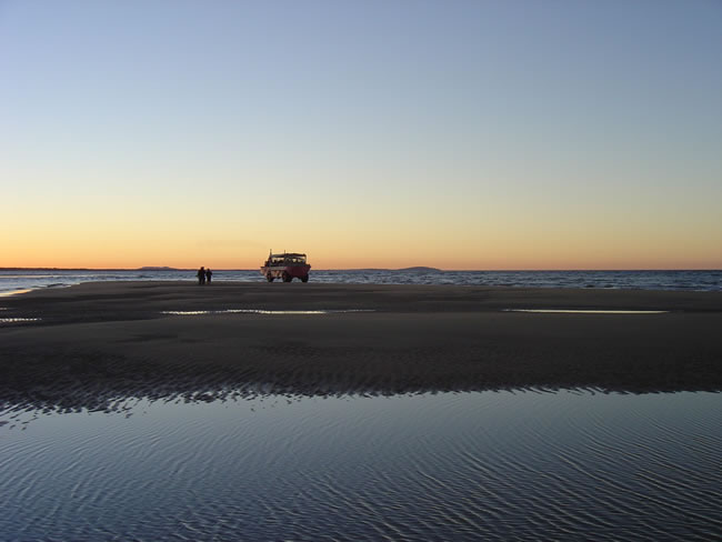 1770 - Eurimbula National Park - Bustard BeachTours up to Bustard Lighthouse go along Bustard Beach. They come back on sunset. This vehicle is called the LARK and has just come across the creek heading back to 1770. We have been told the tour is great and so we will try it next holiday. Previous | Album | Next |