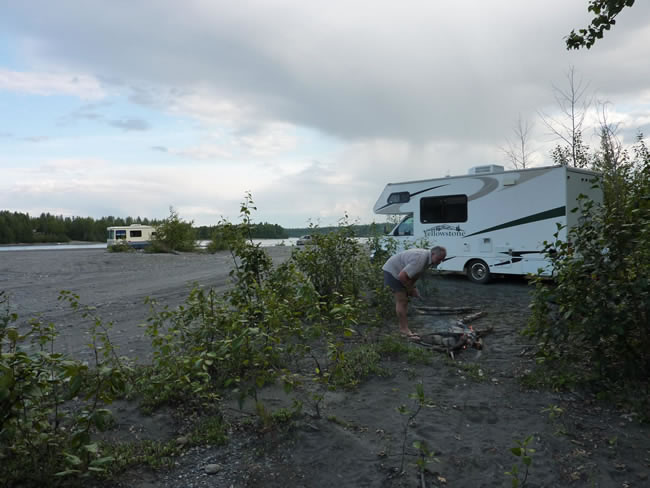 Alaska and Canada HolidayThe next morning we did the short walk around Earthquake Park and part of the Coastal Trail around Cook's Inlet (both interesting and worth a look) before heading out of Anchorage about 1pm. We were surprised the weather was pretty much the same as it was in Brisbane (Australia's winter = Alaska's summer). Jeans and a T Shirt were adequate - and we had brought all that winter gear over expecting it to be cold! We visited Chugach National Park, had lunch and walked to Thunderbird Falls along Eklutna Creek in the Mat-su Valley. Cottonwood Trees were dropping 'cotton' like snow here and lots of other places for the two weeks we were in Alaska. We passed Wasila, which looked a bit like a shanty town with a jumble of very small 'shops' in questionable condition lining the highway. We later found this was quite common in Alaska. We stopped at Talkeetna which is a quaint tourist town which also had these tiny stores - interesting place to wander through. We camped on the Talkeetna River bed. Photo below was taken getting the fire ready to cook dinner sometime about 9pm. Sitting around a fire that night with sunglasses on because of the glare didn't seem quite right - still daylight and not a star in sight! Previous | Album | Next |