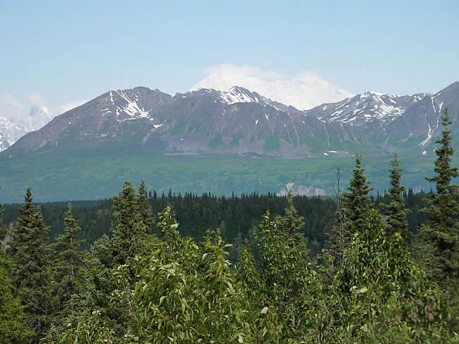 Alaska and Canada HolidayWe loved the colours of Alaska especially from this lookout. It was blue sky over white clouds & snow on the purple jagged rocky mountains rising up out of the intense green vegetation and spruce & birch trees everywhere. Previous | Album | Next |