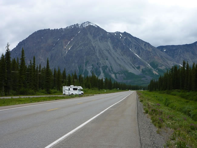 Alaska and Canada HolidayAlso typical of Alaska scenery were the rock slides and avalanche areas. This mountain towered above the road just passed the Nenana River bridge. That is our motorhome where we pulled over for a break. Previous | Album | Next |
