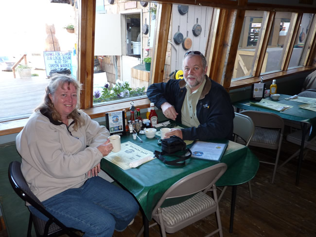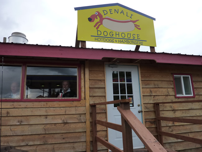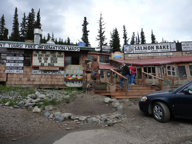 Alaska and Canada HolidayThe Denali Nat Park Visitor Centre was excellent. After spending time there, we went to 'The Canyon' a couple of miles from the park entrance. Motels, restaurants, pubs and a variety of tourist shops and booking agents for flight seeing, river rafting, jet boating etc were jammed into this tiny town which only seems to exist in the summer. They all shut down and return to whichever town/country they came from during the winter months. There are only a handful of families left in winter in Healy 12 mile up the road. We did some shopping, had hot dogs for dinner at the Denali Dog House and the following morning we had breakfast at the famous Salmon Bakehouse (the Stampede Breakfast was reindeer sausages, eggs over easy with jack cheese and a couple of sides along with bottomless coffees of course). Previous | Album | Next |