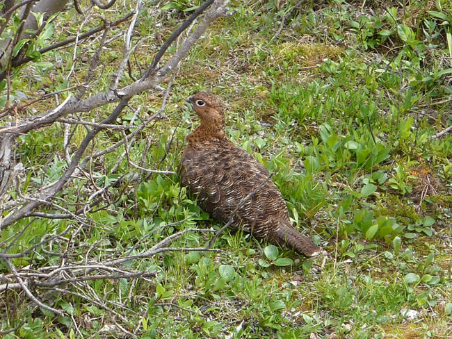 Alaska and Canada HolidayYou can get on and off the shuttle buses that run every half hour through Denali National Park from 4:10am - 12:40am. Yes, you didn't read that wrongly, that is after midnight - people don't seem to do much sleeping here in summer! We stopped at Savage River to do the 2 mile loop walk. As soon as we got off the bus someone told us that there was a Ptarmigan down on the track. I asked the next person we passed "What's a tarmigan?" and they replied "About 8 o'clock" and kept walking. Accents! We later found out it was Alaska's National Bird - it is pure white with big feathery feet in the winter to camouflage in the snow but have a look at the photo of the ptarmigan in summer. Previous | Album | Next |