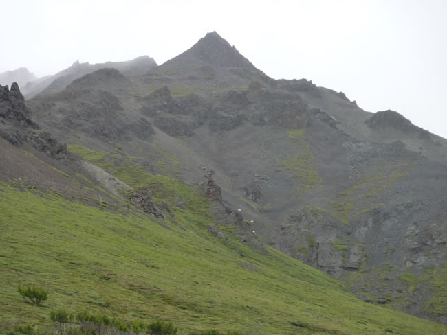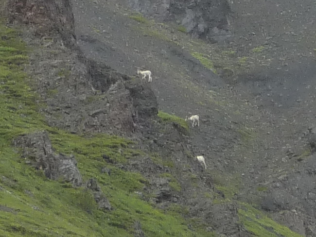 Alaska and Canada HolidayBack in the shuttle bus, we travelled the narrow winding roads deeper into the park. The bus driver was happy to provide commentary and answer any questions yelled out. Whenever anyone on the bus spotted anything interesting the driver would stop so we could all take photos. I spotted Dall Sheep up on the rocky slopes. Have a look at the Dall Sheep up closer. Previous | Album | Next |