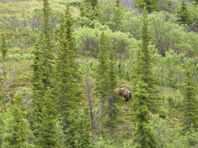 Alaska and Canada HolidayDenali National Park has both black bears and grizzly bears which are brown. Black bears are found in the forested areas of the park. The ones seen from the bus on the open tundra are mostly grizzlies. This grizzly was right near the Park Road when it was spotted but by the time we stopped and took the photo it was wandering off. Previous | Album | Next |