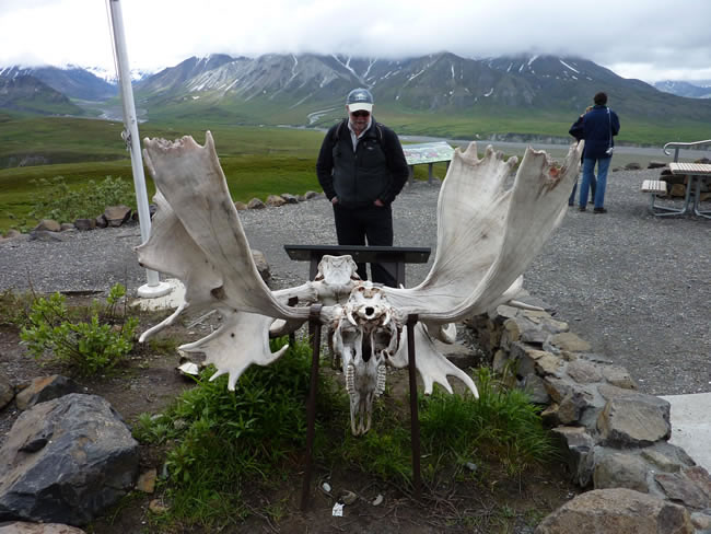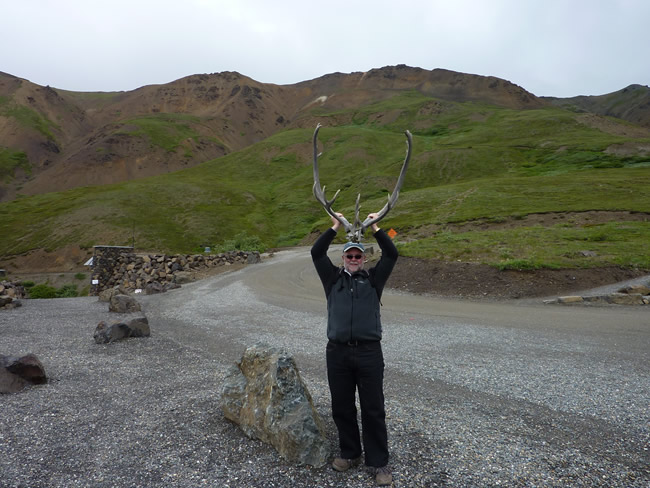 Alaska and Canada HolidayThese two sets of caribou antlers are locked together. The two animals got entangled while fighting and unable to break apart eventually died that way. You can tell these are caribou antlers because they have the large 'shovel-like' antlers to help them dig away the snow when foraging for food. Pete trying on some antlers lying on the side of the road. There is one in every crowd isn't there? Previous | Album | Next |