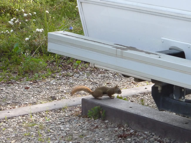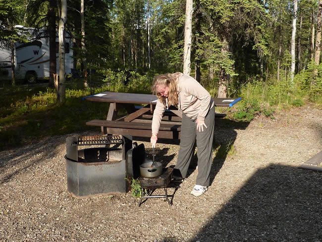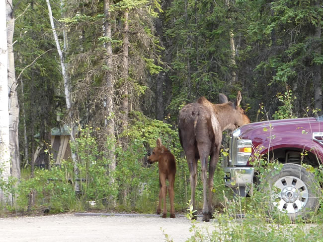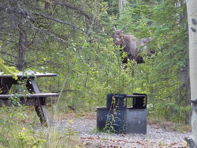Alaska and Canada HolidayBack at camp, we decided to try out the little BBQ that came with the RV to cook dinner. This was a campfire American Style, using Fred Meyer Charcoal Briquettes with 'authentic' BBQ flavour. It was full daylight at 8pm - still not used to this! I got a surprise when I turned around and saw a moose watching through the trees. Next morning Mother and baby moose were still wandering around the campground along with a squirrel who thought this site was really his. Apparently moose kill more people a year than bear. The advice is, if they charge you - RUN! Previous | Album | Next |