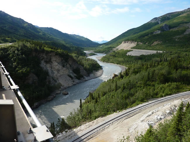 Alaska and Canada HolidayMuch of the way, as you see here, the train line winds through the mountains following the edge of the rivers. Looking straight down at the Nenana river from this bridge we saw the rafters again and the rail track as it wound its way under the bridge. Previous | Album | Next |