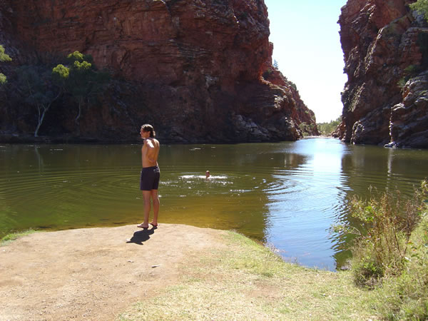 Roadtrip - Part 2, Alice Springs, Uluru, Northern TerritoryThe Elery Creek waterhole was next and is probably one of the prettiest spots for a swim. There is an off road campsite with toilets, electric bbq etc. It is a popular swimming spot but it was quite cool this winter day so not many in the water. Previous | Album | Next |
