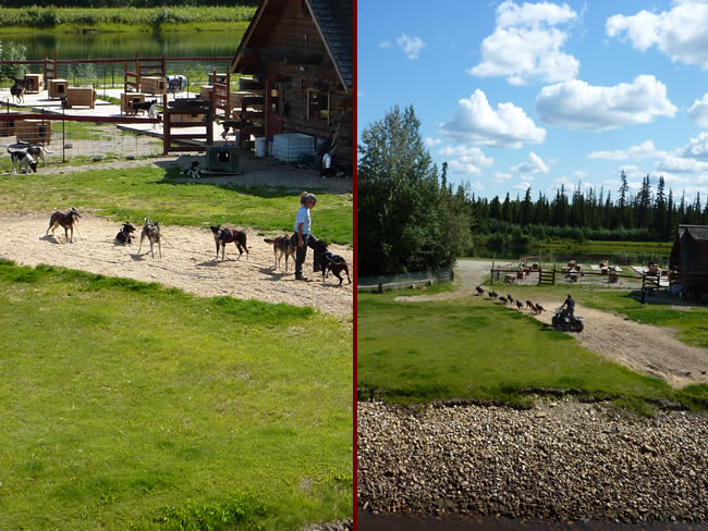 Fairbanks and Arctic Circle, AlaskaThe boat stops next to the home and kennels of four time Iditarod winner, Susan Butcher and her husband. He explains all about their kennels and training their champion dogsled team. Have a look at the Iditarod champion dogs in action pulling an ATV. They love it. They couldn't wait to get hooked up and off around the track out the back of their house. Previous | Album | Next |