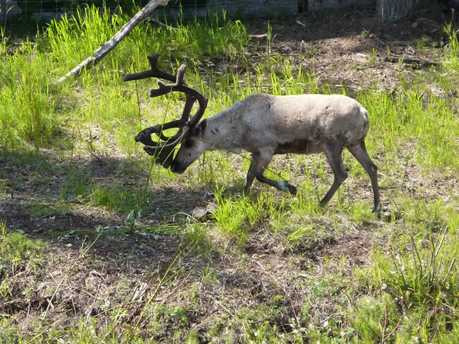 Fairbanks and Arctic Circle, AlaskaWe travel quite close to the river bank and here we saw a number of reindeer. If they are domesticated we were told they are called reindeer and if they are in the wild they tend to be larger and are called caribou. They are from the deer family but found in the Arctic or Subarctic. Have a look at this reindeer up close. Previous | Album | Next |