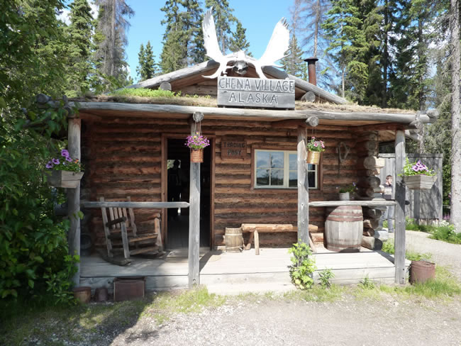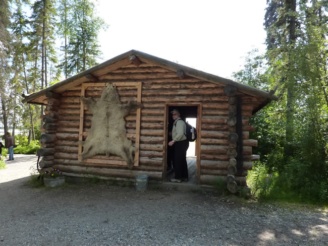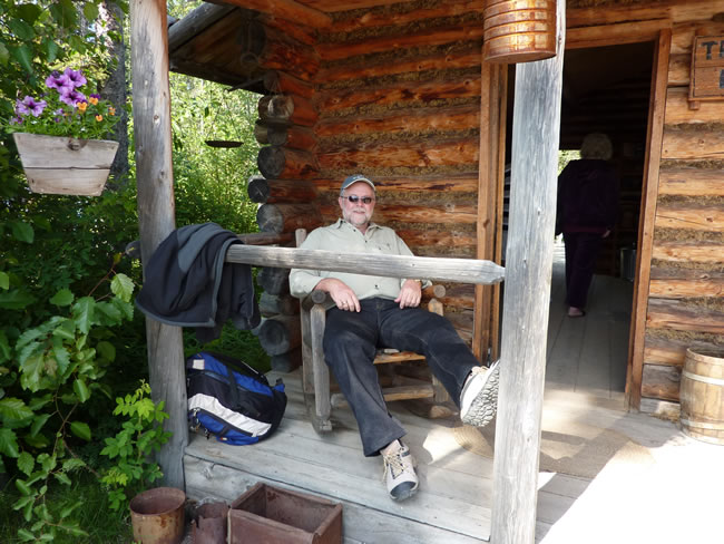 Fairbanks and Arctic Circle, AlaskaThere were a number of cabins made of spruce logs. The back of the cabin had a bearskin drying frame. Inside the cabin was decked out with typical items you would find in a local village store. I loved the feel of the beaver pelt on the counter which was really soft. While I checked it all out, Pete relaxed on the front verandah. Notice the plants growing on the roof? We saw plenty of log cabins similar to this throughout Alaska. Previous | Album | Next |