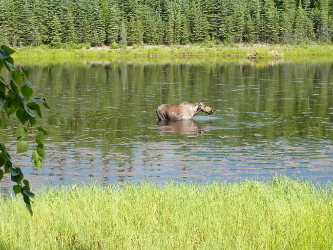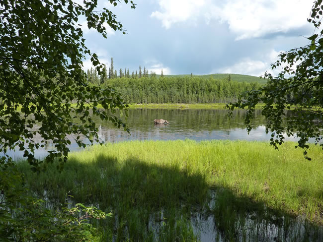 Fairbanks and Arctic Circle, AlaskaThere are lakes and rivers everywhere in Alaska and if you look you can usually spot a moose as you drive by. We stopped and walked closer to the lake edge to take a photo of the moose up close. Previous | Album | Next |
