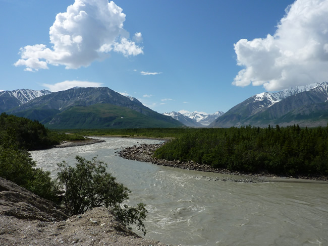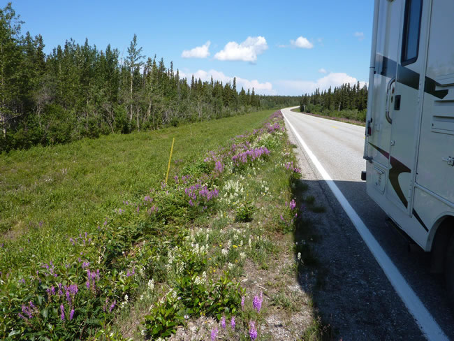 Fairbanks to Valdez, Alaska Canada HolidayAlaska's growing season is quite short but wildflowers are everywhere in summer, especially decorationg the roadsides. The purple Fireweed is Alaska's Regional Flower. It blooms from the bottom petals and works its way up. As the petals open over a course of a few weeks, it eventually becomes "topped out" and Alaskans regard this as the sign that summer is nearly over. Have a look at more of the scenery around this area. Previous | Album | Next |