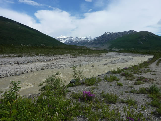 Fairbanks to Valdez, Alaska Canada HolidayThe Delta River was flowing fast with meltwater. It is Rock Four that clouds these glacial streams with finely ground silt. It is produced from the grinding of rocks against each other as the glaciers move across the valley floor. We are told that you can often see herds of bison roaming the Delta River valley and but we were out of luck with that today. We did see a military helicopter and plenty of seagulls - yes seagulls like we have at home and nowhere near the sea. They have the same problems as us it seems as many signes say 'Don't feed the gulls'. Previous | Album | Next |