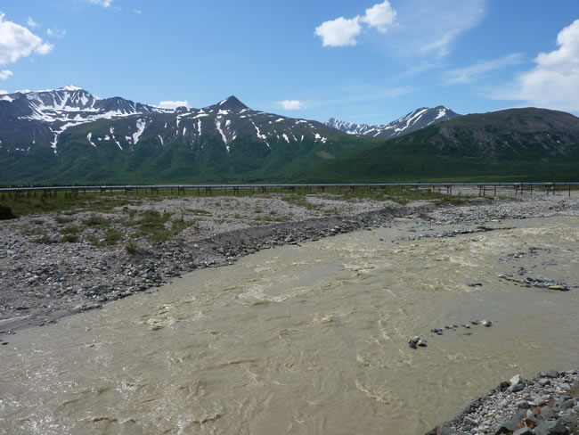 Fairbanks to Valdez, Alaska Canada HolidayThe Alaska oil pipeline parallels the Richardson Highway through the Delta Junction area on its way to the Port of Valdez. We had been following it for a while now since leaving Fairbanks. The line was underground where it crossed the Alaska Highway and on a cable suspension bridge where it crossed the Tanana River. Previous | Album | Next |