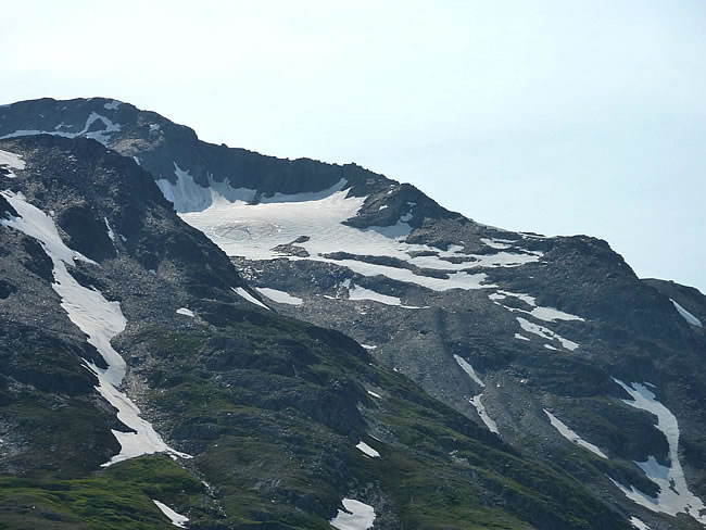 Fairbanks to Valdez, Alaska Canada HolidayAfter we trecked back from Worthington Glacier we stopped to take in the magnificent views all around us. We couldn't quite work out what the circular mark was on the icy patch on this mountain top??? Previous | Album | Next |