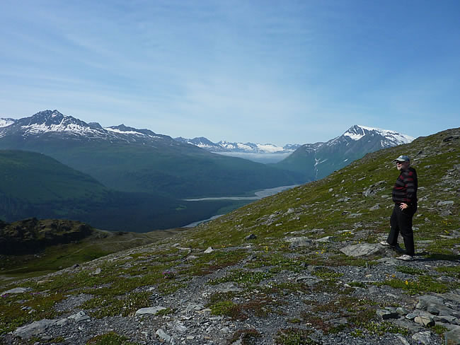 Fairbanks to Valdez, Alaska Canada HolidayThis is taken looking south down the Thompson Pass towards Valdez which is hidden beneath the cloud bank in the distance. This area is known to be the snowiest place in Alaska with the heaviest one-day snowfall of 62 inches. Not today though - we were quite hot by the time we had climbed up here and it was VERY glary so sunglasses and hat were a must. Previous | Album | Next |