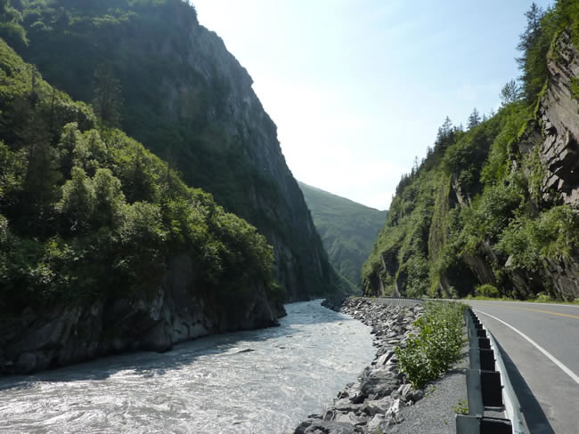 Fairbanks to Valdez, Alaska Canada HolidayAt the base of the Chugach Mountains we followed the Lowe River as it wound its way towards the narrow Keystone Canyon. This was another popular white water rafting spot, not that we saw any this day. Previous | Album | Next |