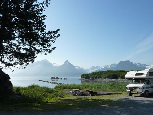 Valdez to Anchorage - AlaskaNext morning we walked from town to the Dock Point Trail Loop and ran across this nice spot near the harbour where a camper was parked. Free camps don't come much better than this. Mind you, we had seen fresh bear skat (complete with digested berries) on the path we had just walked so hope they didn't venture out of the camper at night. Fishing and walks are the thing to do in summer but in winter we are told there is helicopter skiing and heli snowboarding in the Chugach Range surrounding Valdez. Previous | Album | Next |
