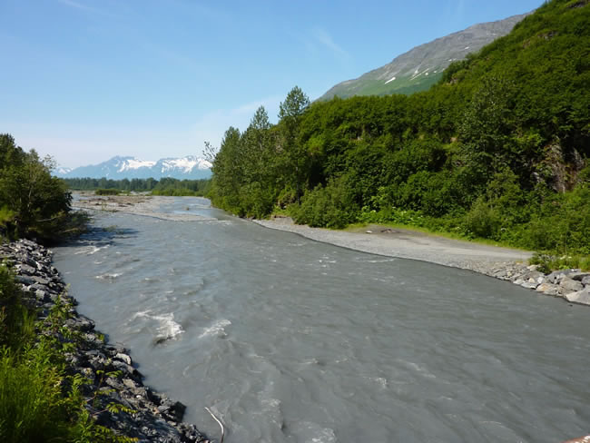Valdez to Anchorage - AlaskaMineral Creek trail is popular for its cross country ski trails and snowmobile tracks in winter that turn into walking trails in summer. They say the mozzie is Alaska's unofficial state bird! but actually we didn't find them too bad in Valdez compared with some of the other places we came across them. They are so slow moving that you can usually swot them before they bite anyway. On the right side of this creek you can see evidence of where someone has previously camped (free). This scene would be wonderful to wake up to. Previous | Album | Next |