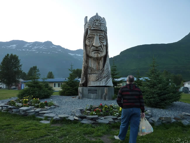 Valdez to Anchorage - AlaskaWe then headed back into town and went for a walk to see where the 4th Juy celebrations would be held. This giant wood carving was in the centre of town. It is 30 feet high and part of a series, called 'Whispering Giants', by Peter Toth. This series is one of 70 carvings found throughout the various states of America done in honour of the American Indians. Previous | Album | Next |