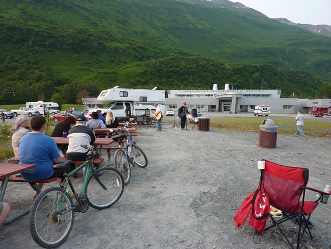 Valdez to Anchorage - AlaskaWe went to the communal bonfire from 8pm - 10pm on a large open area in front of the hospital (medical centre) They had a two man band singing country and western songs and an egg and spoon race for the kids. They were handing out 2 plain sweet biscuits with a large marshmallow and a piece of chocolate. You toast the marshmallow and then squash it with the chocolate between the biscuits. The hot marshmallow melts the chocolate - nice, but one was enough. It was a pretty quiet evening with not that many people around. Back to the RV park to watch the fireworks over the bay at 11pm. The bonfire and fireworks are not very spectacular when it is still daylight/twilight. Notice the people sitting on chairs on top of their RVs for a better view! The echos from the mountains made it sound better than it looked. Previous | Album | Next |
