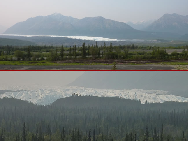 Valdez to Anchorage - AlaskaWe continued down the Glenn Hwy to Matanuska Glacier. The scenery is meant to be spectacular along this stretch of road but unfortunately for us the haze was bad and so it was OK to look at but hopeless to photograph. This shows the glacier in the distance to give you an idea of the size (27 miles long) and then as we drove up closer you can see the face of the glacier. Previous | Album | Next |