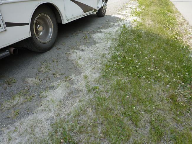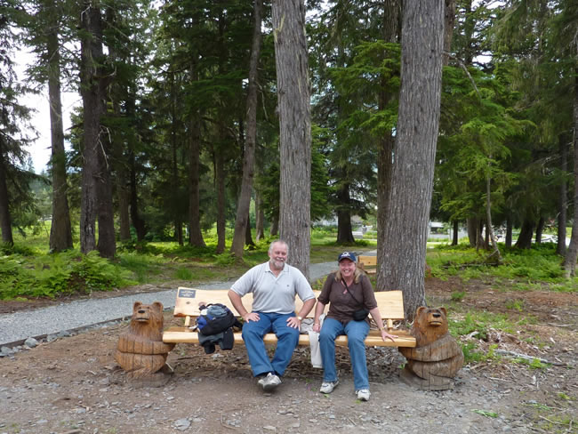 Valdez to Anchorage - AlaskaBack at the bottom of Mt Alyeska again we walked through the resort and found this carved seat with very cute wooden bears holding the bench up - had to have a photo taken! Nearby we saw what looked like snow on the ground by the road but it was all the fluff falling from the cottonwood trees. It was still early so we decided to start off on our Kenai section of the trip - see next webalbum. Previous | Album | Next |