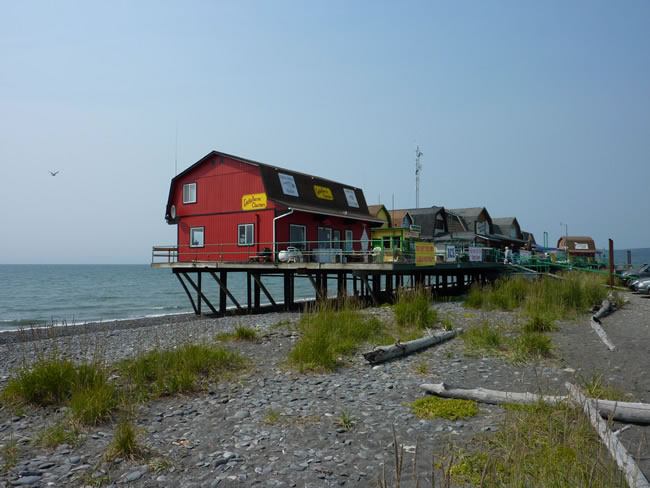 Anchorage to Kenai Peninsula - AlaskaIt was quite windy and nobody would ever consider swimming here. It was the fishing and boating that was the attraction. Apart from the shops and full RV campgrounds there was a resort at the very end of the Spit. Homer is a VERY popular place for the Alaskans to come for holidays. We were happy to vist and move on. Previous | Album | Next |