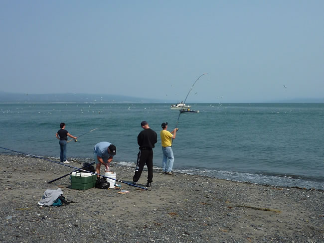 Anchorage to Kenai Peninsula - AlaskaWe watched a few fishermen bring in some fish and walked along the rocky beach at the end of the spit. Pollack and Flounder were being caught while we watched but being thrown back even though they were 1 -2 feet long. Catch-and-release only apparently. Then we headed back into the town proper and went to the Visitor Centre. Definitely worth the stop. Previous | Album | Next |