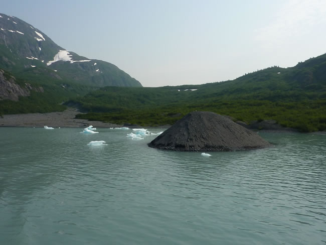 Anchorage to Kenai Peninsula - AlaskaAnother glacier has melted and retreated up this valley but the morraine that it left behind as it originally pushed forward is left in a large pile in the lake. More small icebergs are floating on the edge of the lake. Remember that only about 10% of a glacier is above water and the rest is below so they are much larger than they appear. Previous | Album | Next |