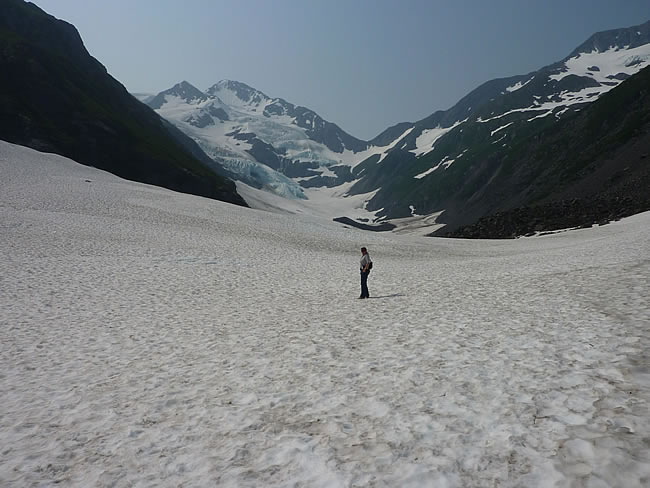 Anchorage to Kenai Peninsula - AlaskaI followed the footprints for a while but we weren't really set up for hiking across the ice so didn't go much further than this. See if you can spot the ice cave in the Byron Glacier in the distance. See the next photo for a closeup. Previous | Album | Next |