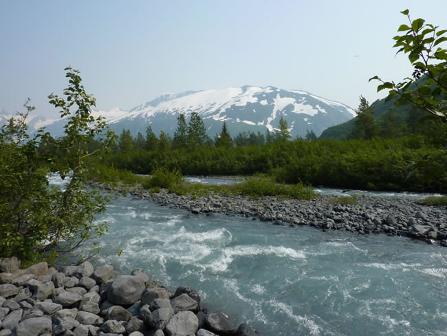 Anchorage to Kenai Peninsula - AlaskaThere were magnificent views from the walking trails. This was typical of the scenery. The icy blue water from this creek also flowed into Portage Lake. What a lovely view of the distant Chugach Mountains. Previous | Album | Next |