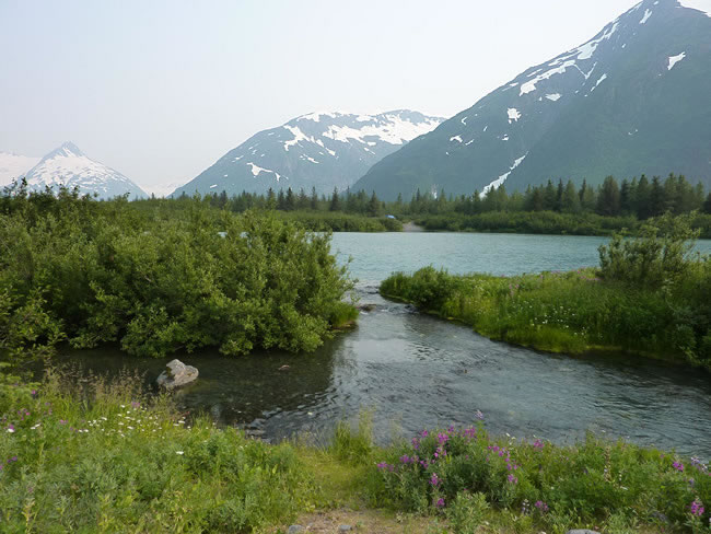 Anchorage to Kenai Peninsula - AlaskaAfter dinner we went for a walk around the nearby lake and along the Williwaw Pond Trail. You can just make out where we are camped across the other side of the lake. The beautiful Chugach Mountains are in the background - they seem to go on forever. You may remember we also saw them from the other side when we were down near Valdez. Previous | Album | Next |