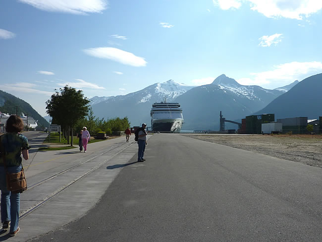 Cruise Skagway to Sitka- AlaskaAlthough the Ryndam has 13 floors to choose from in the lift it is relatively small for a cruise liner. This is good because we get to dock closest to the towns. You can see another ship on left of photo much further out but we get to park in the main street! And what a scenic backdrop. Previous | Album | Next |